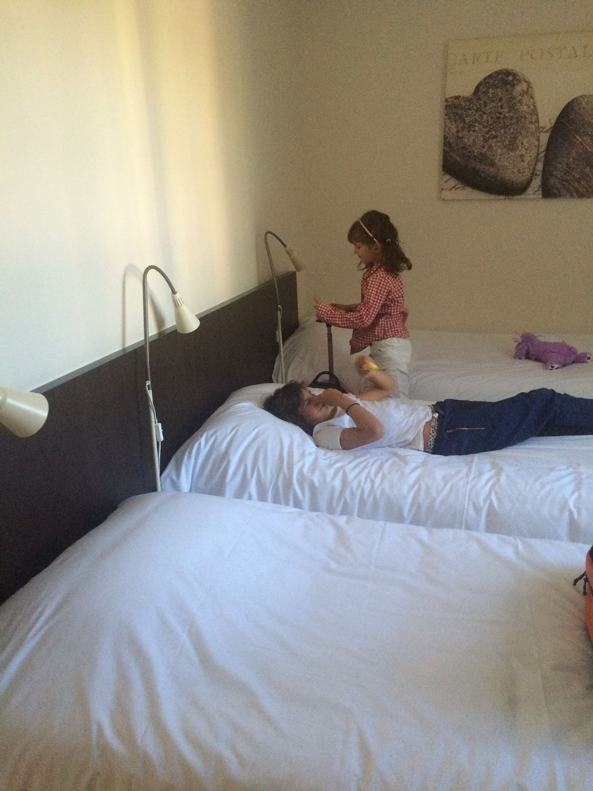 Nous nous sommes donc installés dans notre chambre familiale pour cinq, en rez de jardin, la chambre est spacieuse, lumineuse, la décoration sobre, nous avons même une salle de bain avec baignoire, un bureau et le wifi gratuit !
